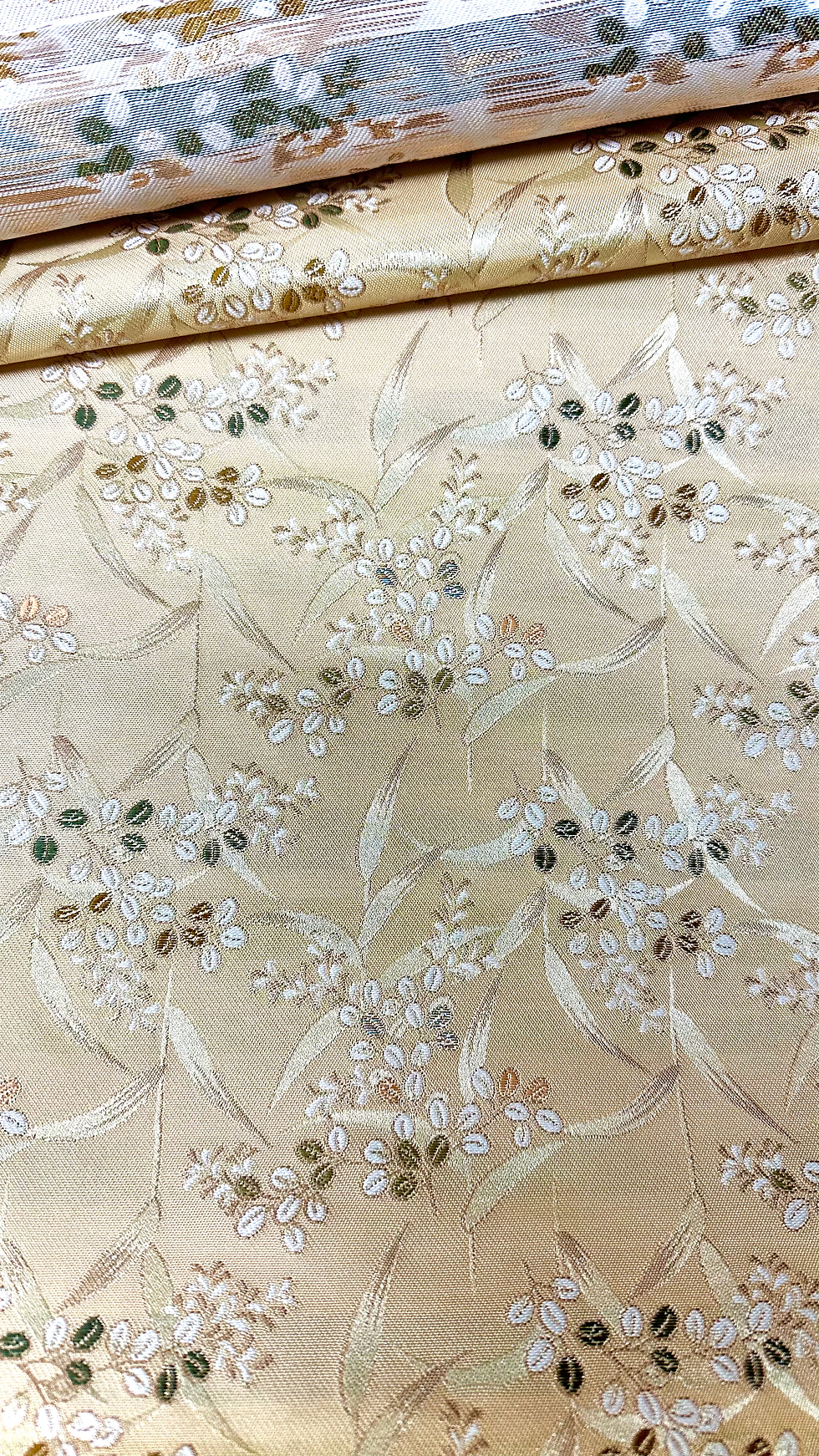 ヴィンテージ西陣織を長年にわたり収集してきました。これらの生地は、伝統技法を用いて精緻に織られ、金糸や銀糸がふんだんに使われています。「経糸(たていと)」と「緯糸(よこいと)」を非常に巧みに組み合わせることで、立体感のある美しい模様を作り出します。 デザインの複雑さによっては、10メートル(1反)を織るのに数週間から数ヶ月かかることもあります。もともと、この美しい織物は着物や帯として使用されていました。 保存されてきた西陣織が耐久性を証明しています。 贅沢な風合いと上品な光沢が特徴です。また、西陣織ならではの技法である金箔加工が施され、伝統美を際立たせています。 絹の西陣織は高級感があり、伝統的な美しさを持つ一方で、慎重なメンテナンスが必要です。一方、ポリエステルの西陣織は耐久性に優れ、お手入れが簡単で、コストパフォーマンスも抜群です。それぞれの素材には独自の魅力があり、用途や好みに応じて選ぶことができます。 100年以上前のヴィンテージシルクの織物は非常に希少であり、高価なものが多くなっています。